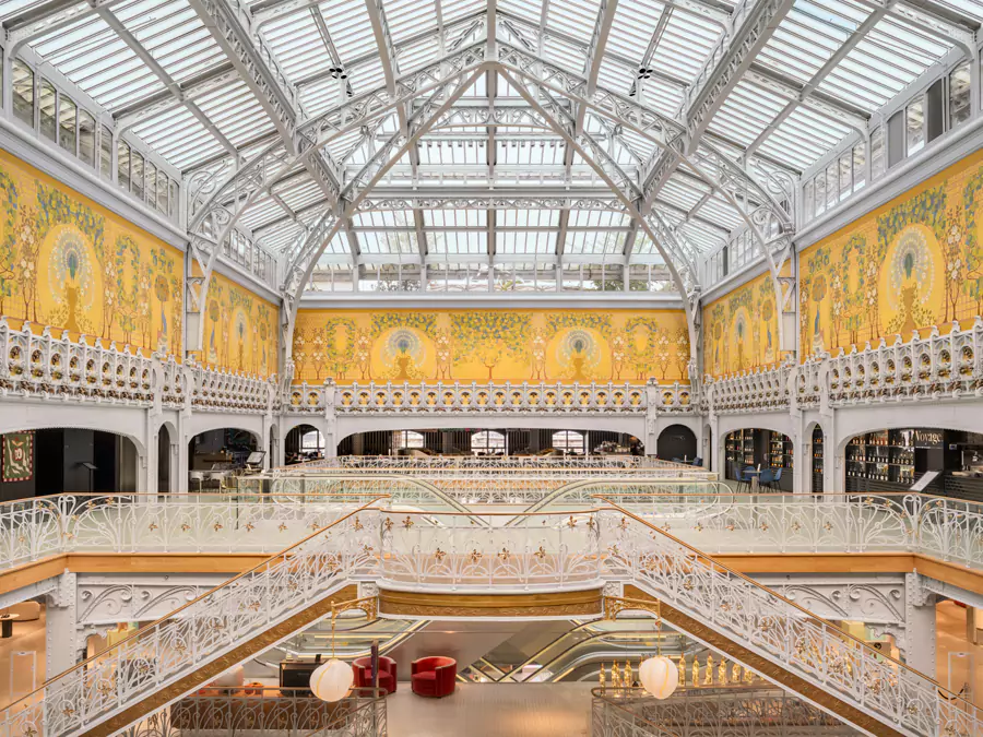 屋顶下方绵延115米、高达3.5米的孔雀壁画,绚丽夺目,被视为新艺术风格的杰作。这幅壁画由Francis Jourdain创作,他是新艺术风格建筑设计师Frantz Jourdain之子。凭借众多工匠的精湛技艺,壁画现已重现其鼎盛时期的绚丽色彩。