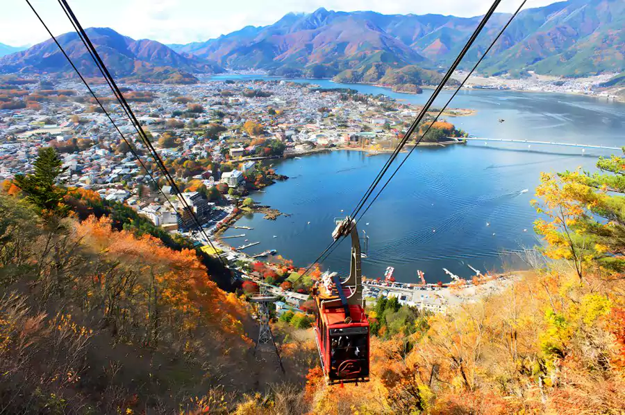 踩在上面,脚下传来簌簌的声响,仿佛是秋日专属的乐章。你可以沿着步道漫步,近距离感受红叶的绚烂;也能搭乘周游巴士,随车身缓缓前行,将湖光山色与红叶美景尽收眼底;若想换个视角,乘坐缆车升至高空俯瞰,整片红叶林与富士山、河口湖构成的画面,更会让你惊叹于自然的神奇。到了 11 月,富士山山顶开始积雪,洁白的雪顶与山间的红黄绿三色树林相映成趣,再配上澄澈的蓝天,美得让人失语。