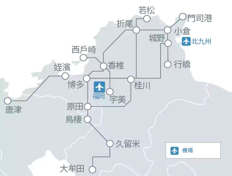 | 福冈都市圈及周边博多~小仓~门司港、城户南藏院前等 | 北九州全域(福冈、长崎、熊本、大分、佐贺) 含部分新干线(博多~熊本等) |