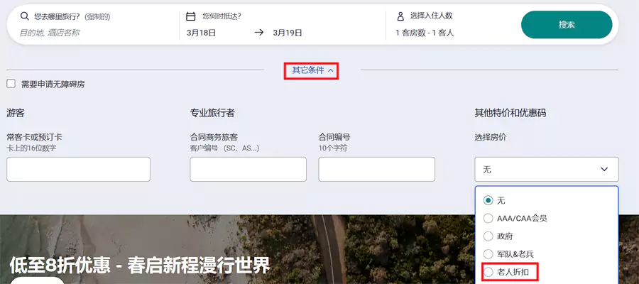 查询酒店时,点击“其他条件”,在“选择房价”这里就能找到“老人折扣”。