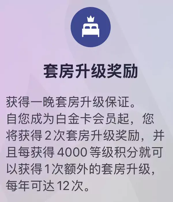 比如,我有60个房晚以及1000定级积分,这时通过房晚就可以升级为白金,拿到2张套房券。但第三张套房券要等账户中累积到18000定级积分时才能收到。