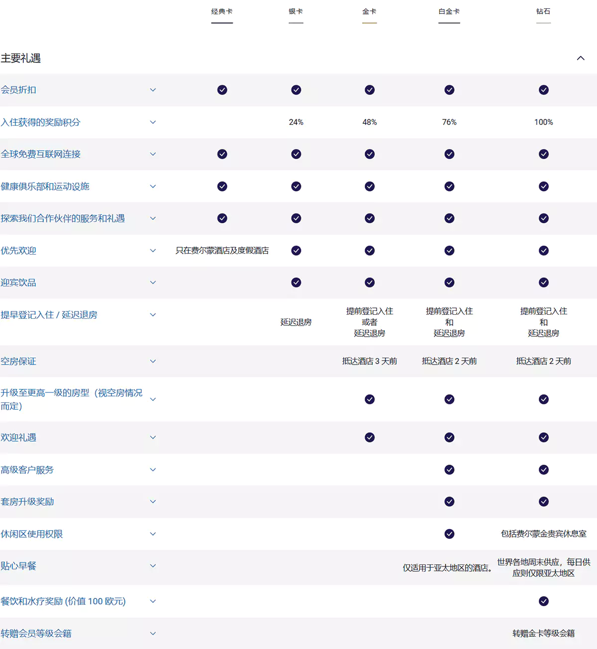 - 白金卡: 一年入住60晚,或者累计14000分(消费5600欧元)