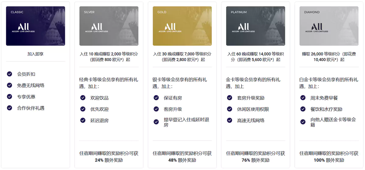 在雅高会员的六个等级中,经典卡加入即享,无任何要求,Limitless 会员为邀请制。雅高各级别会员升级要求如下: