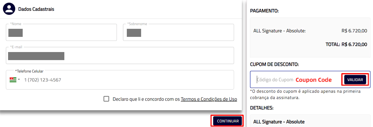 左边灰色的是确认你的姓名和邮箱,右侧红色的地方就填写本次的优惠码,然后点”Validar“确认使用优惠码,最后点”COntinuar“下一步去填写信用卡支付信息就行了。