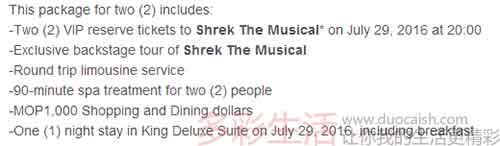 一晚澳门康莱德的住宿,两张”怪物史瑞克“音乐剧的VIP门票,音乐剧后台参观,机场豪车接送,90分钟的SPA,1000澳币的购物或餐饮券。