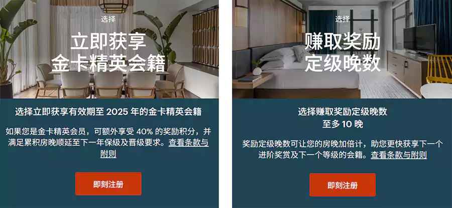 你可以选择注册“立即获享金卡”也可以选择“赚取奖励定级房晚”,不过只能选择一项活动注册。
