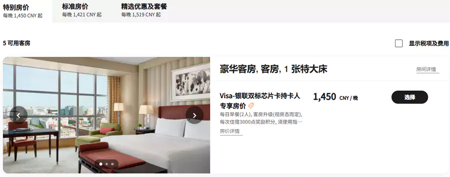 这个房价带有“Visa-银联双标芯片卡持卡人专享房价”的标识。而且价格就是标准房价(图片上显示的标准房价1421是会员标准房价)。