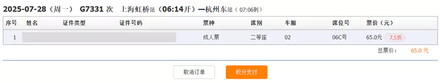 然后在支付页面看一下乘客信息、车次是否正确,没问题,就点击“积分支付”按钮支付就行。