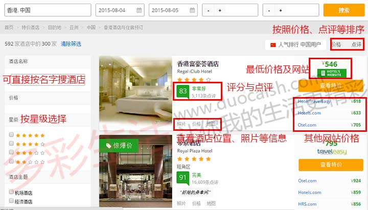 查询也很简单,比如我打算查询8月4日香港的酒店价格,输入城市、入住日期、人数之后,点search,就显示如下: