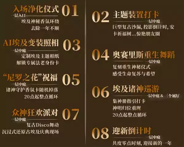 临近午夜,欢乐的氛围将达到顶峰,大祭司与众神共同向在场的时间旅者献上新年祝福,礼花喷射,彩带飘舞, 随着新年钟声响起,和埃及众神一起迎接新年曙光,体验前所未有的新年倒计时吧!