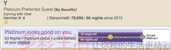 在所有的酒店常旅客计划(酒店忠诚计划)中,Stay、Night、积分都是记录客人入住经历的重要因素。各位朋友打开自己的账户都可以看到相关的Stay、Night记录。比如下面这个喜达屋SPG的账户: