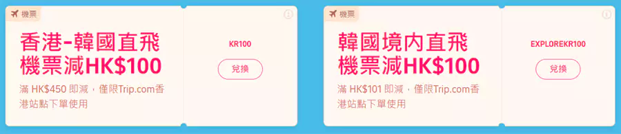 本次活动页面提供了两个优惠代码,分别是香港往返韩国立减HK$100,以及韩国国内机票立减HK$100。