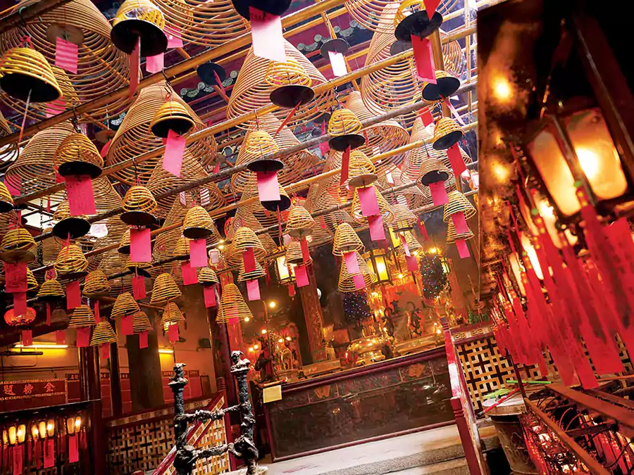 上环的文武庙,是《胭脂扣》的取景地之一。这座历史悠久的庙宇,充满了神秘的东方韵味。铜钟、灰塑、陶塑、神像,还有那昏暗灯光下的岭南塔香,都营造出一种别样的氛围。